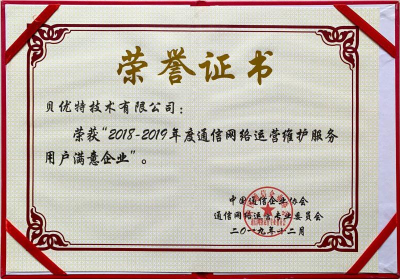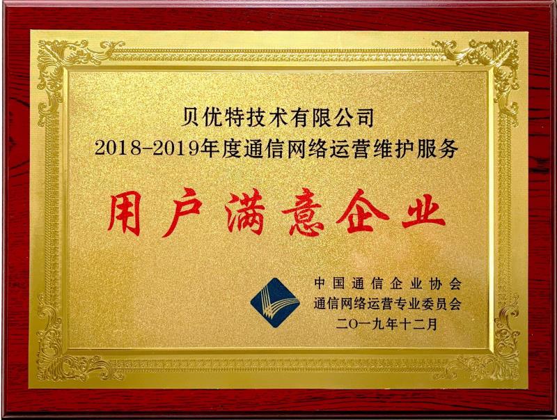 在這辭舊迎新之際,公司喜獲由中國(guó)通信企業(yè)協(xié)會(huì)、中國(guó)通信網(wǎng)絡(luò)運(yùn)營(yíng)專業(yè)委員會(huì)頒發(fā)的”2018-2019通信網(wǎng)絡(luò)運(yùn)營(yíng)維護(hù)服務(wù)用戶滿意企業(yè)“的榮譽(yù)獎(jiǎng)牌及證書。
